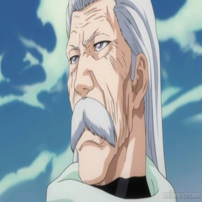 This is a picture of Ginrei Kuchiki, a fictional character, a calm and patient man who was the leader of the Kuchiki clan in the manga Bleach. Kuchiki Ginrei has the appearance of an elderly man with slate gray eyes, a gray mustache, and long gray hair. He wears the standard captain's uniform along with a white scarf.
